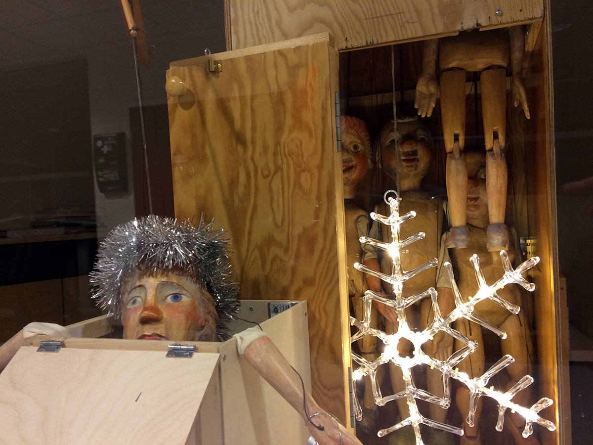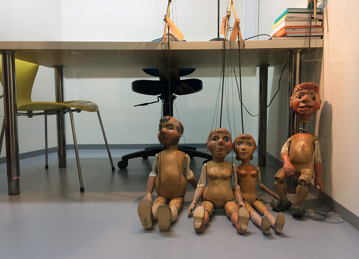 Objektet eller protagonisten, eller det jeg har kalt alt fra ‘diskursive teatermaskiner’, ‘mobile skulpturer’, eller ‘gående scenografi’ har i stor grad handlet om å undersøke det politiske potensialet i objekt-orientert og performativ populærkultur, forholdet mellom høykultur som performance og skulptur, og folke- eller populærkultur som dukketeater og komedie. Jeg gikk kritisk og lekent inn i steder og situasjoner for å framstille ulike former for alternativ (kan det gjøre dette?). De første ukene da jeg hang rundt på Akademi for scenekunst og prøvde å skjønne hva det var og hva jeg skulle gjøre med det minimale stipendiatkontoret jeg hadde fått, fant jeg fem tsjekkiske tremarionetter i ei pappkasse på rekvisittrommet. De ble i sin tid laget av Josef Vitek (KALD, nå Academy for Performing Arts in Prague) som øvelsesdukker. Tsjekkia er sentral når det gjelder utvikling og fornyelse av dukketeater, også politisk og for voksne. Dukkene bygger på Commedia dell’arte tradisjoner, som er kjent for lystige improvisasjonskomedier med faste rollefigurer og et enkelt hendelsesforløp som ikke var så viktig i seg selv, men var mer et påskudd for improviserte og omreisende forestillinger. Selve begrepet marionette (ikke fri) er interessant i seg selv (tenkte jeg). Jeg bestemte meg for å bruke dem, og de har bebodd kontoret sammen med annet relevant materiale i en slags visuell dagbok (foto ved siden av) siden 2015. Et tidlig videoarbeid med dukkene Being John Malkovich. The puppet version ble gjort på en workshop sammen med studenter.