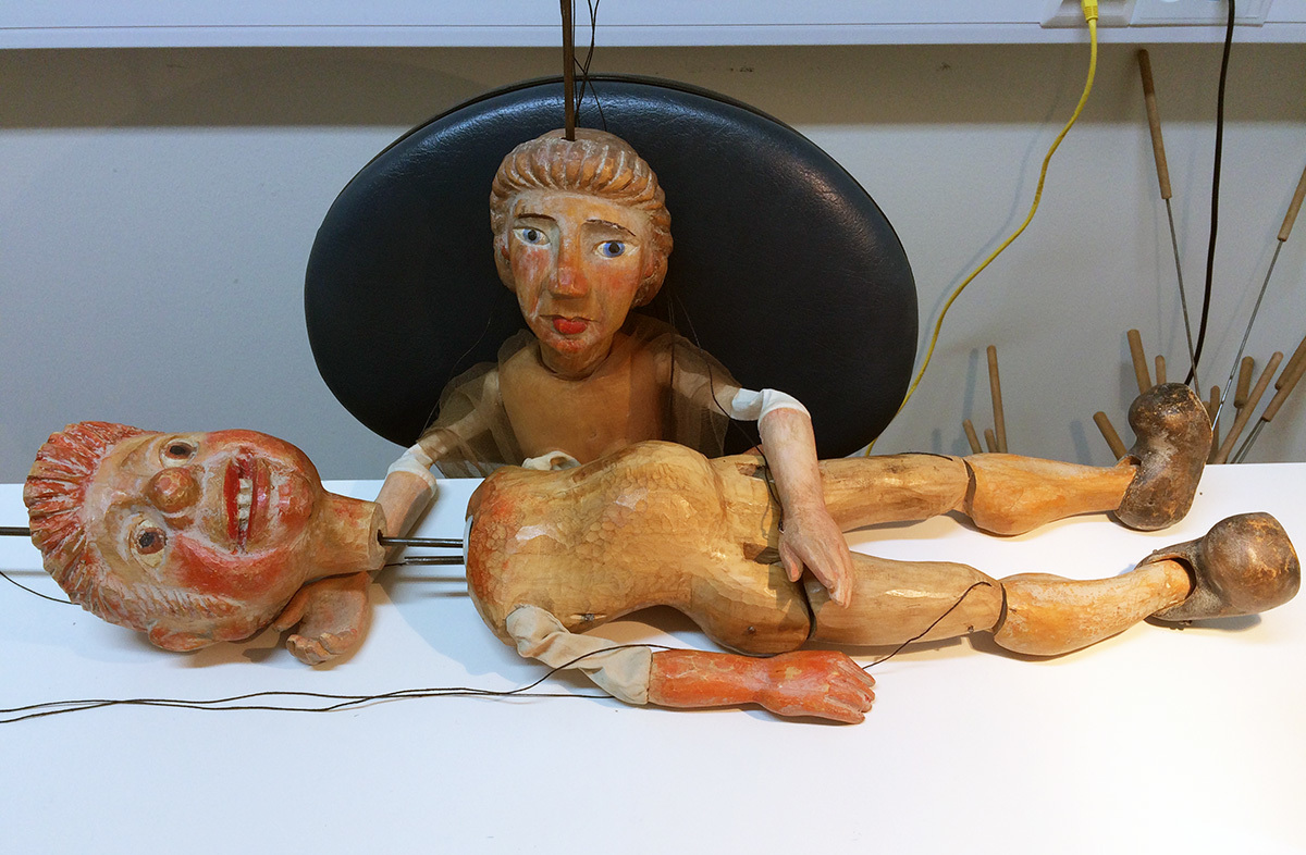 Akademi for scenekunst er en annen. Skolen ble startet på nitti-tallet som dukke- og figurteaterskole, men valgte tidlig å gå i retning av det postdramatiske og performative, med fokus på teori, nye former for samarbeid og kunstneriske hybrider, akkurat som det jeg kom fra, eller til og med basert på Baktrupske former og metoder. Jeg følte meg hjemme der, men var helt fra begynnelsen mest interessert i den dramatiske figur- og dukketeaterfortida de ikke snakket så mye om. Vi tenker gjerne på figurteater som en form for dukketeater, og knytter det til barneforestillinger. Men figurteater er nærmere billedkunsten og det objekt-orienterte som for eksempel performance og installasjonskunst, eller historiske former som übermarionetter, ‘mannekenger’, roboter og automater.